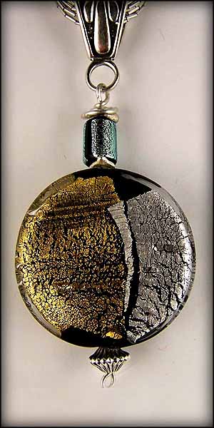The magnificent silver and gold coin bead is lined with silver and gold leaf and handmade in Italy by world-famous glass artists, the shiny silver bead (dichroic) is created under tremendous pressure (discovered in building spaceships), and the flat silver beads are each hand-beaten by members of a mountain tribe in Thailand. All other beads and findings are sterling-silver and made in the USA. Pendant comes with a liquid silver (sterling) necklace. Length of pendant: 3.5”-4.0”