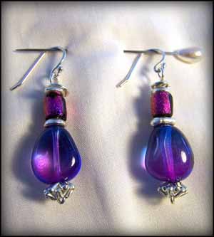 The magnificent glass bead is hand made in Czechoslovakia by world-famous glass artists, the shiny colored bead (dichroic) is created under tremendous pressure (discovered in building spaceships), and the flat silver beads are each hand-beaten by members of a mountain tribe in Thailand. All other beads and findings are sterling-silver and made in the USA. Length of earrings: 1.5”-2.5”